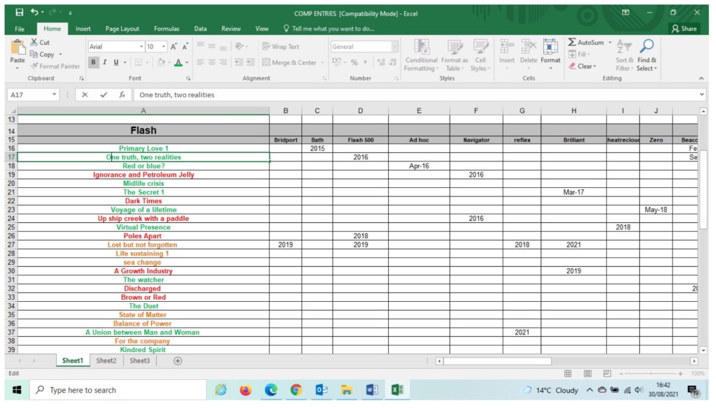 As I write this, I have sixteen previously rejected stories without a home and seven stories entered somewhere, with five of these seven stories having been entered more than twice before to different competitions or anthologies. Keeping track is therefore very important. I use an excel spreadsheet of stories, colour coded for ‘Ready to enter’ as green, ‘Currently entered’ as orange, and ‘Won, don’t use again’ as red in the rows and the completion / anthology source as the columns.